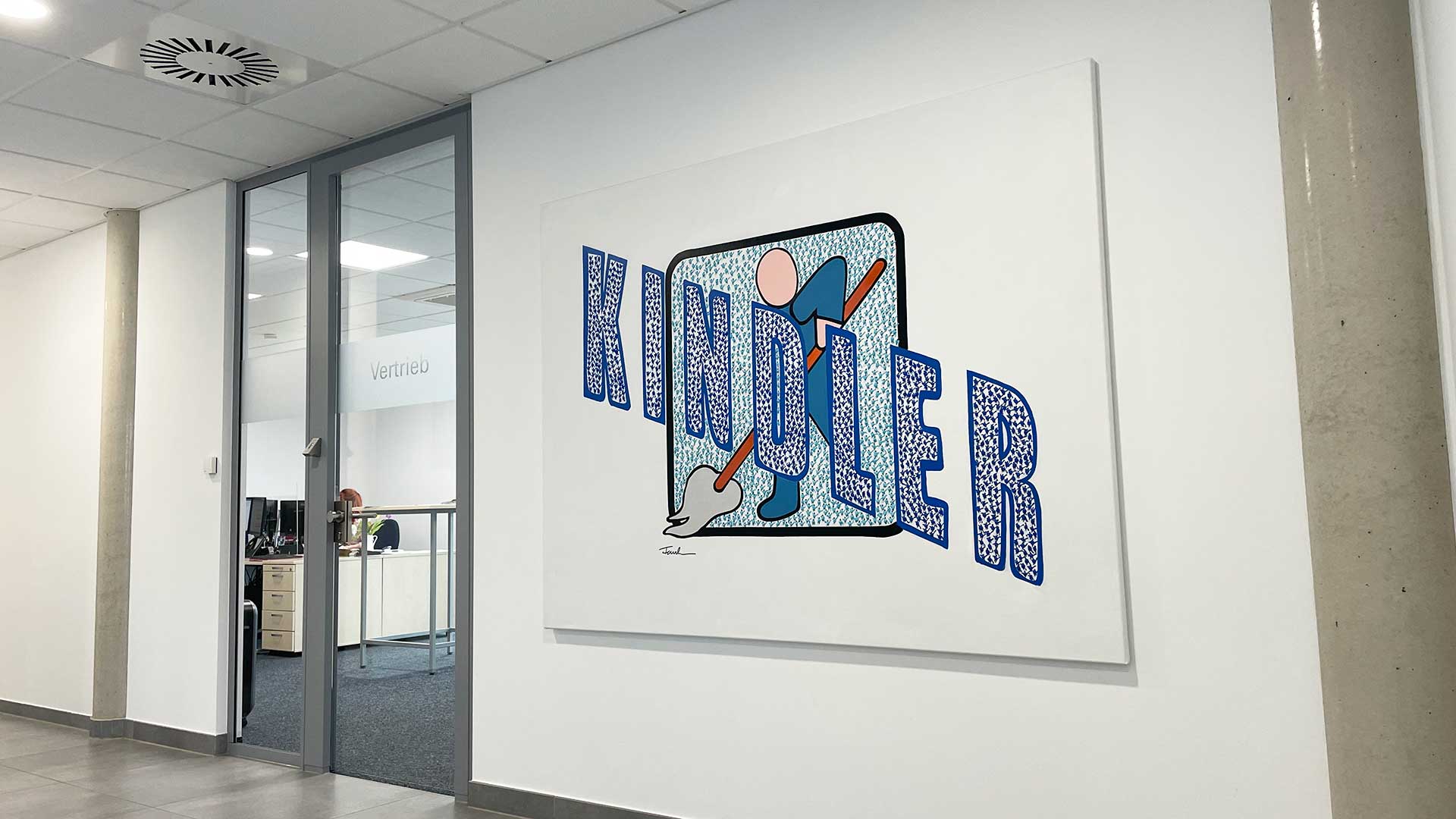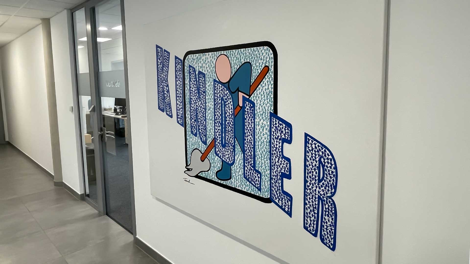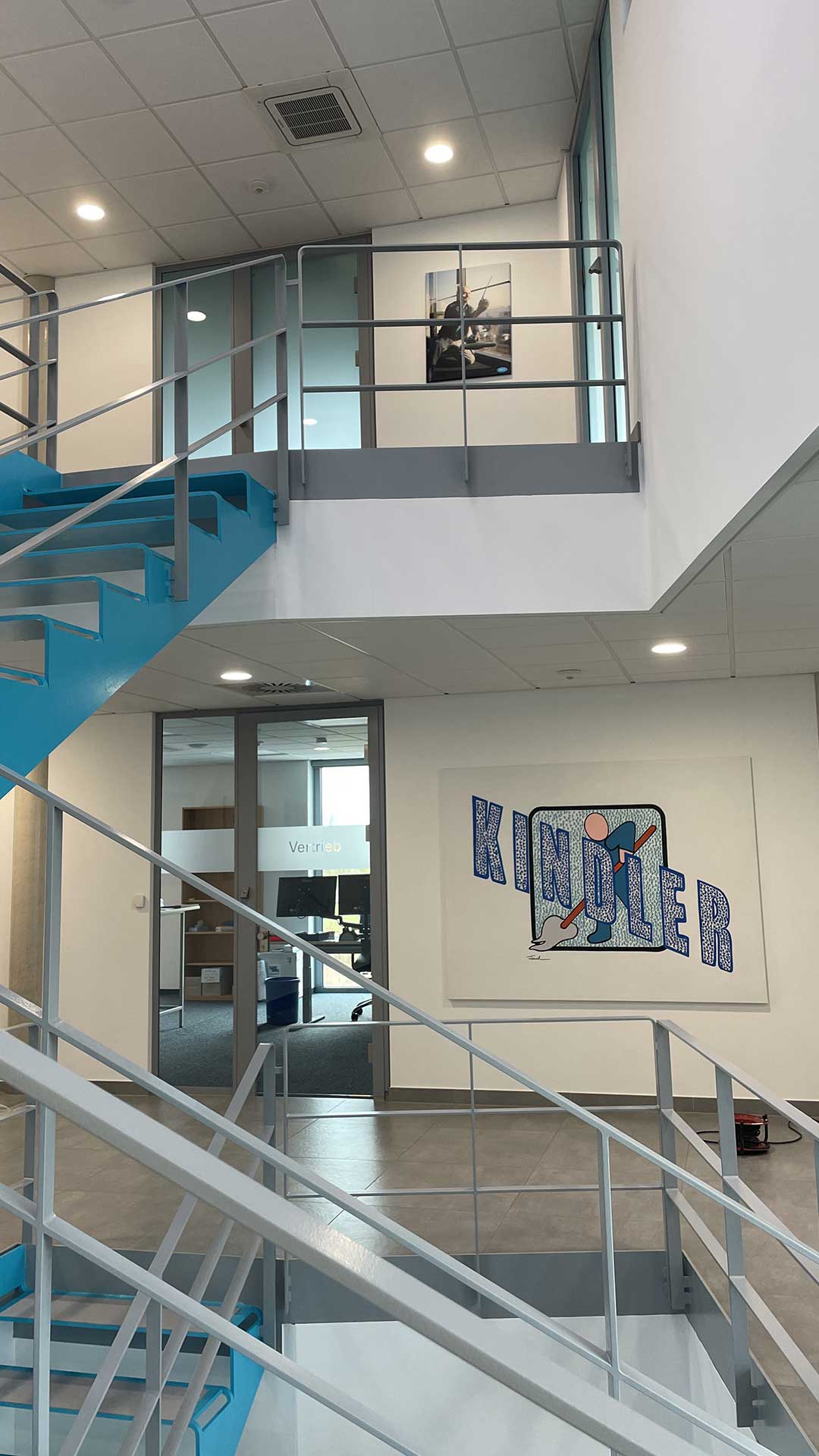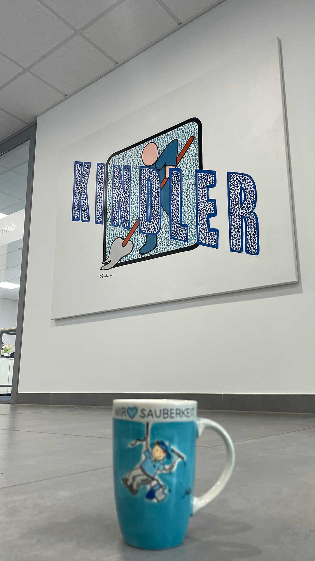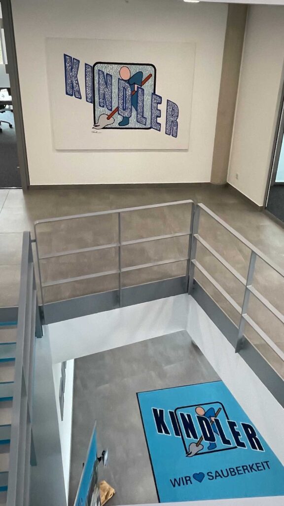 Dieses handgemalte Logo verleiht der Marke eine einzigartige Note. Durch die persönliche künstlerische Gestaltung wirkt es lebendig und individuell. Der dazugehörige Schriftzug „Wir lieben Sauberkeit“ ergänzt das Werk zu einem Kunstkonzept für den Bürokomplex.