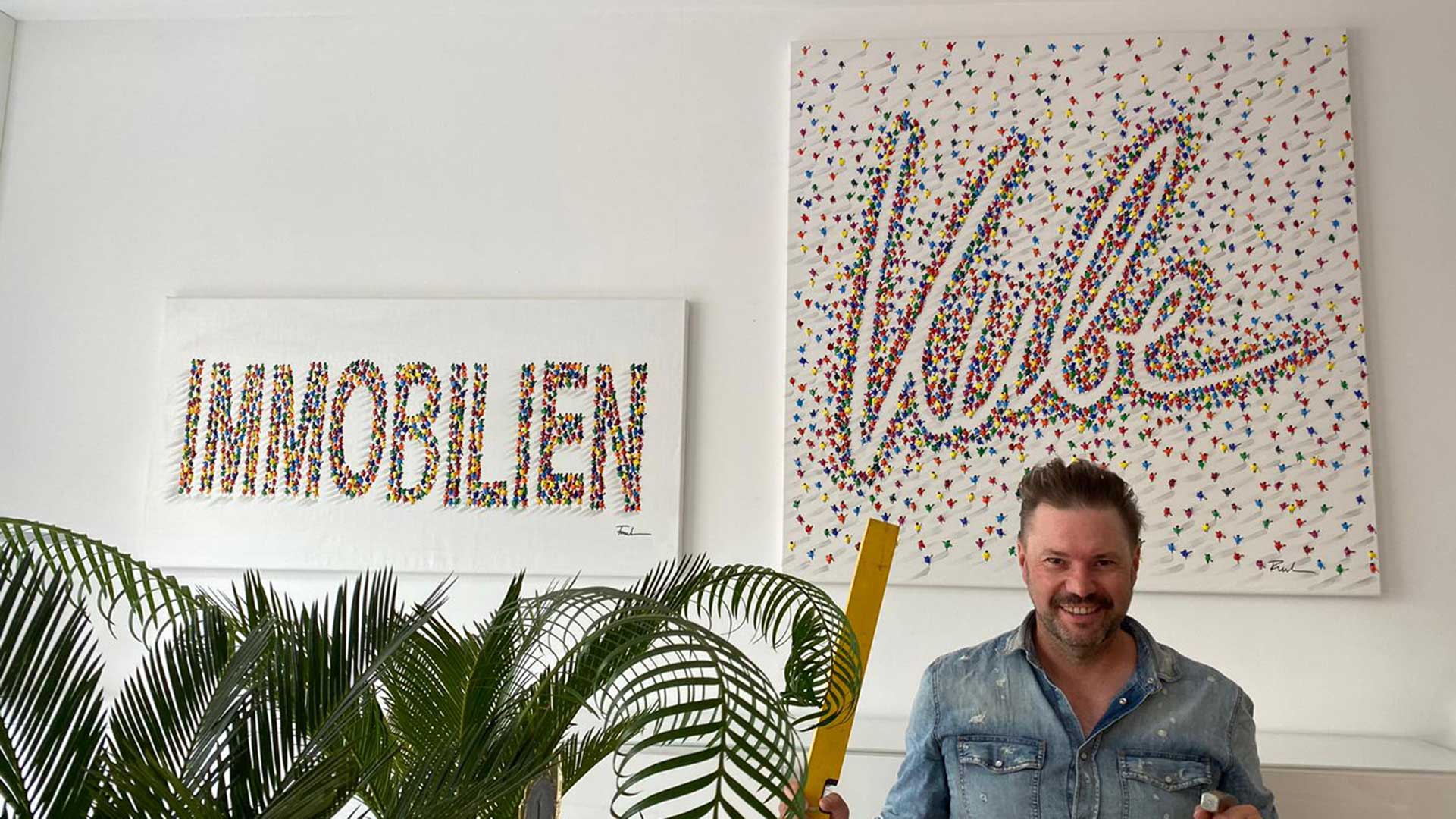 Kunstwerke verleihen Räumen eine ästhetische Anziehungskraft und werten sie auf. Abhängig von den Farben, dem Thema und dem Stil des Kunstwerks kann es eine beruhigende, inspirierende oder anregende Atmosphäre schaffen. Die Atmosphäre eines Wohn- und Arbeitsraumes wird so also maßgeblich von Kunst bestimmt. Passend dazu haben wir das Logo eines Immobilienbüros als handgemaltes Leinwandbild umgesetzt. Das Werk verleiht dem Firmenlogo eine lebendige Identität – zusammengesetzt aus unseren einzigartigen Pointers.